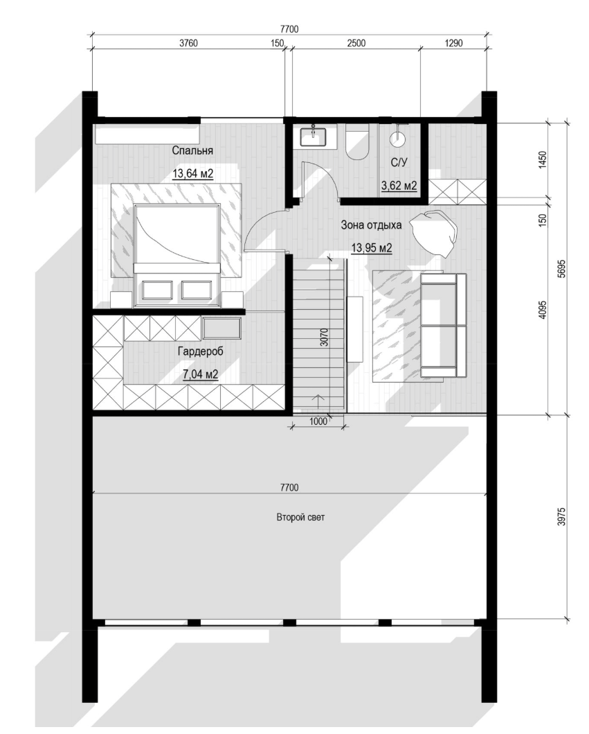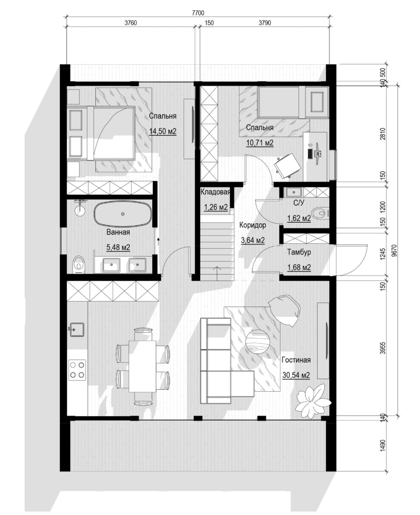 Простота форм – коробка в виде вытянутого прямоугольника, двускатная крыша, минималные свесы. Жесткий каркас из опорных клееных балок. Второй свет на всей протяженности или в одной из торцевых частей. Панорамное остекление, максимум свободного пространств.